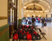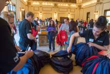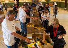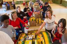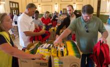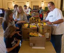 Volunteers help fill 8,500 backpacks with school supplies for low-income kids in the Grand Ha