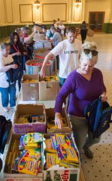 Volunteers help fill 8,500 backpacks with school supplies for low-income kids in the Grand Hall at the Gateway, during United Way of Salt Lake's 22nd annual Day of Caring, Thursday, September 11, 2014.