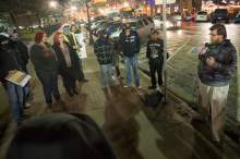 Craig Bowden talks to a dozen or so people against police violence, in front of the Federal B
