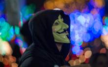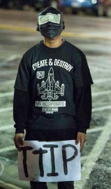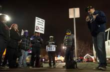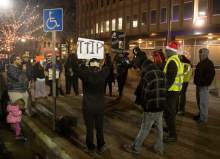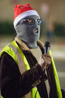 Matt Champion wears a mask as he holds a sign with group of people protesting against police violence, in front of the Ogden Police Station ,Saturday, December 20, 2014