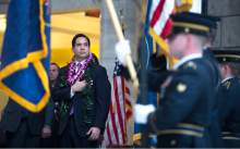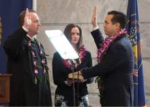The oath, administered by Utah Supreme Court Justice Thomas Lee, hit a glitch when Reyes' wife, Saysha, noticed midway through the oath that her husband had his wrong hand on the Bible. Reyes switched hands, and Lee restarted the oath.