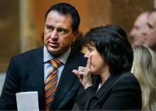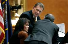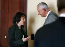 House Speaker Becky Lockhart, R-Provo, speaks with Senate President Michael Waddoups, R