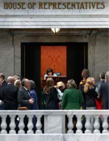 Speaker of the House Becky Lockhart, R-Provo, is seen through the open doors of the Utah House of Representatives, Thursday, February 7, 2013.