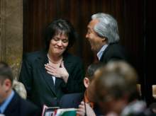 House Speaker Becky Lockhart, R-Provo, speaks with Senate President Michael Waddoups, R-Taylorsville, in the Senate lounge after the morning seesion was adjourned.