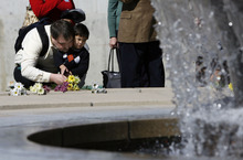Placing flowers, Brian Hoopes of Taylorsville stays close his son Patrick, 3, who is tethered to him for his intravenous fluids since he was essentially born without intestines. On Wednesday, April 4, 2012, Patrick ceremoniously started the Celebration of Life Monument fountain on Library Square in Salt Lake which is dedicated to those who have given the gift of life through organ, eye, tissue and blood donation. Patrick has been on the donor list for a small intestine for three years.