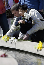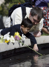 Placing flowers, Brian Hoopes of Taylorsville holds on to his son Patrick, 3, who needs to stay within a tethered distance for his intravenous fluids since he was essentially born without intestines. On Wednesday, Patrick ceremoniously started the Celebration of Life Monument fountain on Library Square in Salt Lake which is dedicated to those who have given the gift of life through organ, eye, tissue and blood donation. Patrick has been on the donor list for a small intestine for three years.