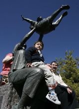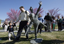 Patrick Hoopes, 3, of Taylorsville explores all the statues surrounding the Celebration of Life Monument at library square after he ceremoniously started started the fountain. The monument is dedicated to those who have given the gift of life through organ, eye, tissue and blood donation. Patrick has been on the donor list for a small intestine for three years. Patrick who was essentially born without intestines has been on the donor list for three years in hopes of getting a small intestine.