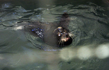 Since he couldn't see the opening, having been blinded in some sort of battle or accident in the open seas before his rescue two years ago by the Marine Mammal Care Center in Los Angeles, Hanenburg got Big Guy's attention by repetitive pats on a home plate-size piece of plywood.
