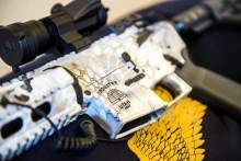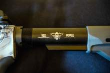 The carbon fiber weapon is surprisingly lightweight, covered in a white Cerakote finish with a gray beehive pattern. The state motto, "Industry," is emblazoned on the side with a beehive. On the stock is etched a honeybee, the state insect, and the phrase "Vox Populi," the Latin phrase for "Voice of the People," which is the motto of the Utah House.