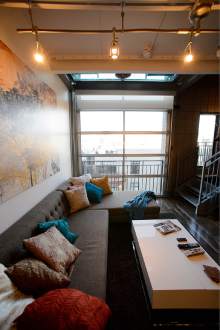The eight-story building has a spacious inner courtyard with a multistory backlit waterfall, ground-level shops and rooftop patios. There is an abundance of glass walls, exposed fixtures and industrial finishes. Some units combine work and living spaces.