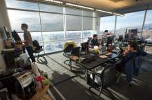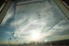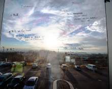 With notes written on the windows, Blake Borgeson, of Recursion Pharmaceuticals, works on