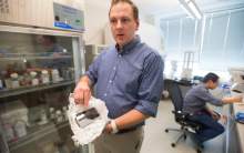 Recursion Pharmaceuticals CEO Christopher Gibson hold experimental plates created in the