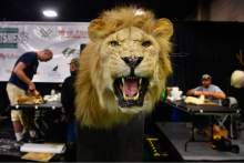 A lion is on display as the taxidermy competition is underway in the background at the International Sportsmen's Expo at the South Towne Expo Center, Thursday, March 12, 2015. The show continues through Sunday.