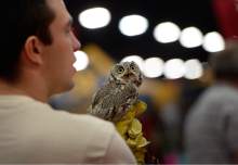 Josh Day holds a Western Screech Owl at the International Sportsmen's Expo at the South Towne Expo Center, Thursday, March 12, 2015. Day was there with the Great Basin Wildlife Rescue Organization. The show continues through Sunday.