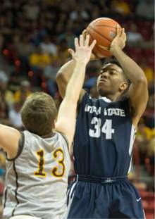 Utah State Aggies guard Chris Smith (34) shoots over Wyoming Cowboys guard Jack Bentz (13) in Mountain West Conference Basketball Championship action, Utah State vs. Wyoming, at the Thomas & Mack Center in Las Vegas, Thursday, March 12, 2015.