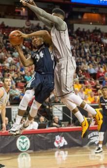 Utah State Aggies guard Viko Noma'aea (1) takes the ball to the hoop as Wyoming Cowboys forwa