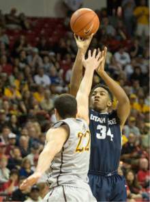 Utah State Aggies guard Chris Smith (34) shoots over Wyoming Cowboys forward Larry Nance Jr.