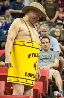 A Wyoming fan cheers on his team in Mountain West Conference Basketball Championship action, Utah State vs. Wyoming, at the Thomas & Mack Center in Las Vegas, Thursday, March 12, 2015.