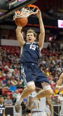 Utah State forward David Collette (13) dunks the ball for the Aggies in Mountain West Conference Basketball Championship action, Utah State vs. Wyoming, at the Thomas & Mack Center in Las Vegas, Thursday, March 12, 2015.
