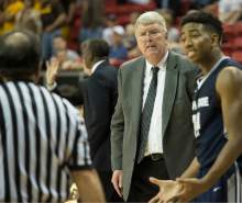 Utah State head coach Stew Morrill and Utah State Aggies guard JoJo McGlaston (24) react as Wyoming appeared to have more than 5 seconds to inbound the ball with less than 5 seconds left in the game in Mountain West Conference Basketball Championship action, Utah State vs. Wyoming, at the Thomas & Mack Center in Las Vegas, Thursday, March 12, 2015.