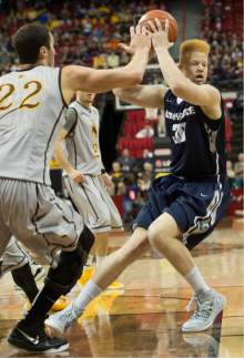 Utah State Aggies forward Sean Harris (30) looks to pass as