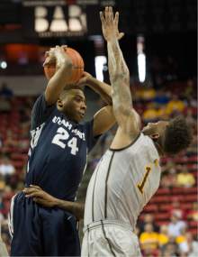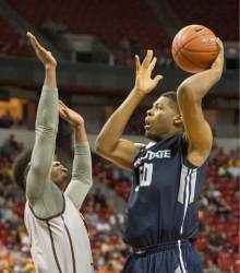 Utah State Aggies guard Chris Smith (34) shoots over Wyoming Cowboys forward Larry Nance Jr. (22) in Mountain West Conference Basketball Championship action, Utah State vs. Wyoming, at the Thomas & Mack Center in Las Vegas, Thursday, March 12, 2015.