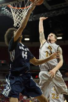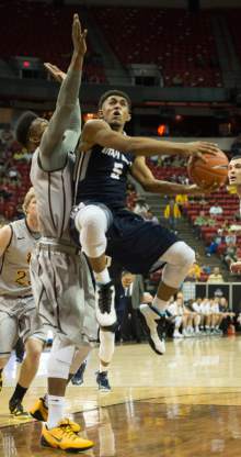 Utah State Aggies guard Viko Noma'aea (1) takes the ball to the hoop as Wyoming Cowboys forward Derek Cooke Jr. (11) defends in Mountain West Conference Basketball Championship action, Utah State vs. Wyoming, at the Thomas & Mack Center in Las Vegas, Thursday, March 12, 2015.