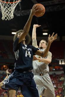 Utah State Aggies forward David Collette (13) goes in for a shot over Wyoming Cowboys guard