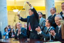 After signing it, Gov. Gary Herbert holds up a copy of SB296, which gives statewide non-discrimination protections to the gay and transgender community, while providing safeguards for religious liberty, in the rotunda of the State Capitol Building, Thursday March 12, 2015.