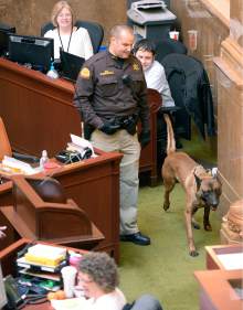 UHP K9 Officer Spencer Beardshall lets his partner Rocco, a bomb sniffing dog, inspect around the Speaker of the House podium in the Utah House of Representatives on the final day of the 2015 legislative session in Salt Lake City Thursday March 12.