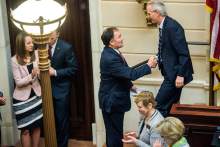 Gov. Gary R. Herbert shakes the hands of Senate President Wayne Niederhauser during the la