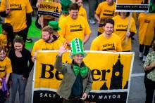 The push to re-elect Ralph Becker didn't make many friends at Saturday's St. Patrick's Day Parade what with campaign workers surrounding the mayor decked out in orange T-shirts behind a large orange sign that read: Becker for Salt Lake City mayor.