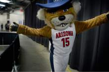 The Arizona Wildcat mascot walks the back hallways during half-time of their win over Ohio State, Saturday, March 21, 2015.