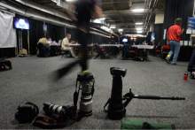 Cameras wait in the photo workroom prior to the Utah vs Georgetown game, Saturday, Mar