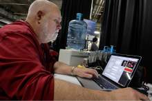 AP photographer Don Ryan files photos to his office prior to the Georgetown vs Utah game, Saturday, March 21, 2015.