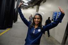 A Georgetown cheerleader poses in the hallway prior to game time, Saturday, March 21,