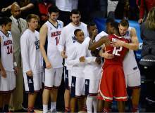 Arizona players embrace vanquished Ohio State players as they move on to the Sweet Six