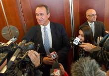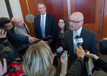 Former Attorney General Mark Shurtleff talks to the media after his scheduling hearing at the Matheson Courthouse, Monday, March 23, 2015. Third District Court Judge Randall Skanchy set a June 15 date for a hearing to determine whether Shurtleff will stand trial on bribery and corruption charges.
