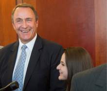Former Attorney General Mark Shurtleff and his daughter Annie listen as attorney Richard Van Wagoner talks to the media after his scheduling hearing at the Matheson Courthouse, Monday, March 23, 2015. Third District Court Judge Randall Skanchy set a June 15 date for a hearing to determine whether Shurtleff will stand trial on bribery and corruption charges.