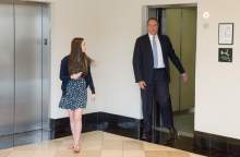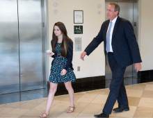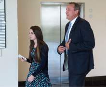 Former Attorney General Mark Shurtleff and his daughter Annie make their way to Judge Randall