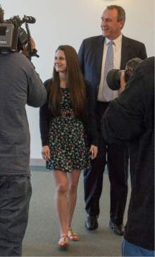 Former Attorney General Mark Shurtleff and his daughter Annie listen as attorney Richard Van Wagoner talks to the media after Shurtleff's scheduling hearing at the Matheson Courthouse, Monday, March 23, 2015. Third District Court Judge Randall Skanchy set a June 15 date for a hearing to determine whether Shurtleff will stand trial on bribery and corruption charges.