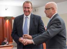 Former Attorney General Mark Shurtleff and his attorney Richard Van Wagoner have a discussion