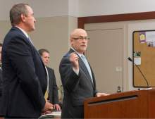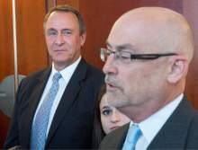 Former Attorney General John Swallow, right, and his attorney Stephen McCaughey enter Judge Royal Hansen's courtroom in Salt Lake City Wednesday July 30. Swallow along with former attorney general Mark Shurtleff are charged with receiving or soliciting bribes, accepting gifts, tampering with evidence, obstructing justice and participating in a pattern of unlawful conduct.