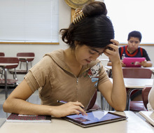 In a different part of the school building, students learning English as a second language in Camille Farias' class practiced writing on the devices. They used a program that instantly showed them spelling and grammatical mistakes. The program also rated their writing skills.
