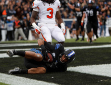 On the second play of the fourth quarter, Kyle Van Noy got a hand on Vaz's third-down pass, but OSU tight end Colby Prince came down with the deflection in the end zone in the middle of three Cougar defenders.