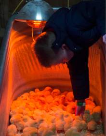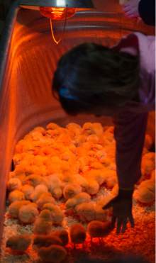 Youngsters reach into a trough of baby chicks at This Is the Place Heritage Park as the park kicks off its Baby Animal Season Thursday with opportunities for visitors to pet and hold lots of baby animals in Salt Lake City, Thursday, April 2, 2015.