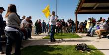 A group of people listened to San Juan County Commissioner Phil Lyman in Blanding's Centennial Park Saturday May 10, 2014, prior to an ATV ride into Recapture Canyon, closed to motorized use since 2007 to protect the seven-mile long canyon's archeological sites.