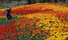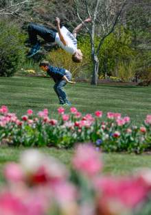 Kayden Brown, top, and his cousin Wyatt Brown flip around the grounds as Thanksgiving Point's annual Tulip Festival opens to the public on Friday, April 10, 2015, boasting 250,000 tulips over 55 acres and is open daily (except Sundays) through May 9.