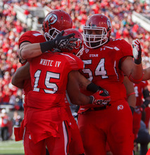 Utah running back John White (15) celebrates a touchdown with teammates as Utah hosts Washington State, college football at Rice-Eccles Stadium Saturday November 3, 2012 in Salt Lake City.