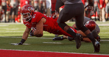 Utah fullback Max Moala (48) scores a touchdown as Utah hosts Washington State, college foo